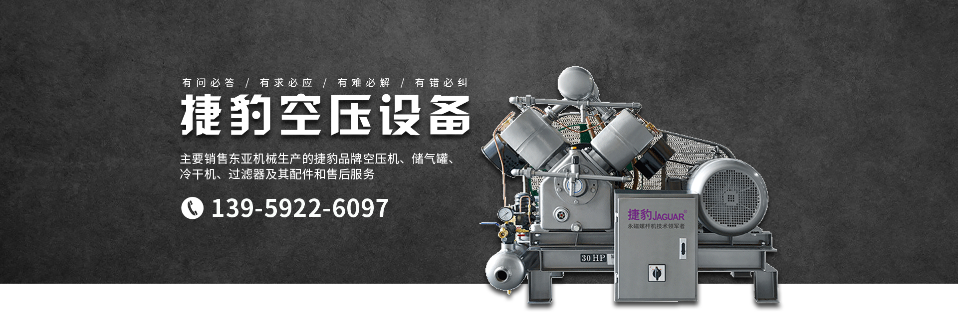 主要銷(xiāo)售東亞機(jī)械生產(chǎn)的捷豹品牌空壓機(jī)、儲(chǔ)氣罐、冷干機(jī)、過(guò)濾器及其配件和售后服務(wù)。